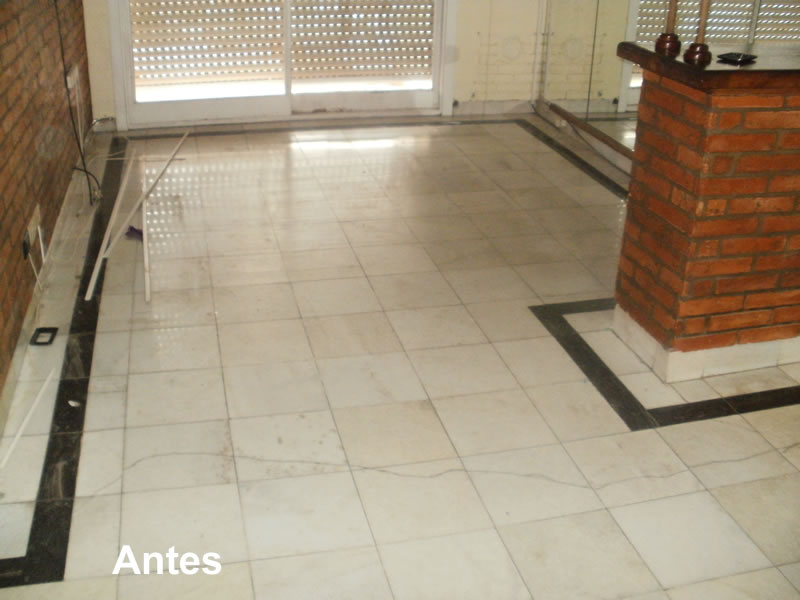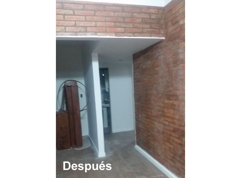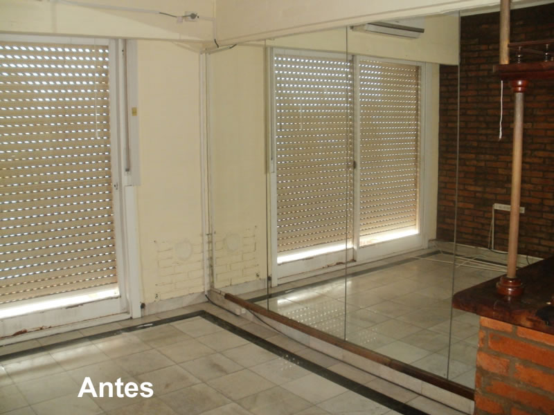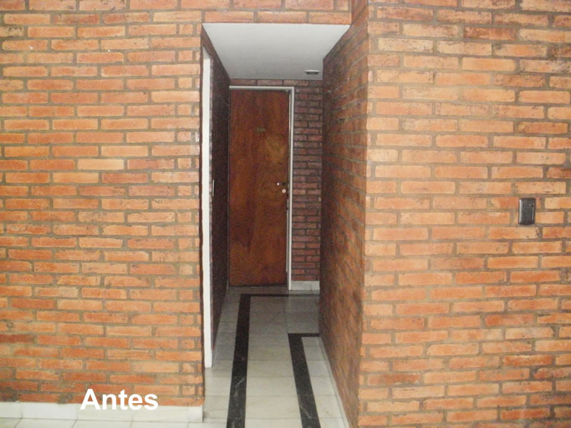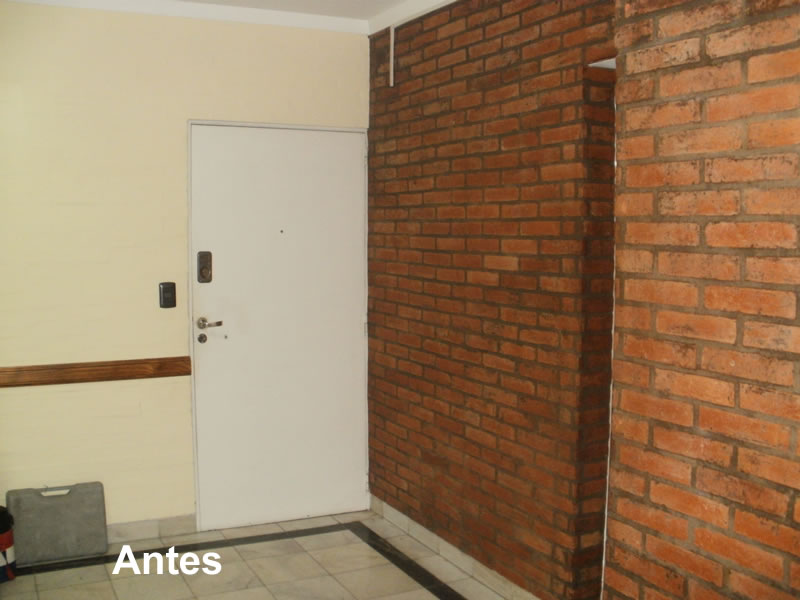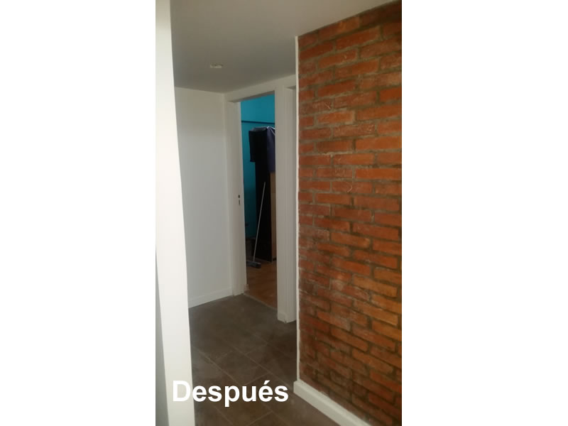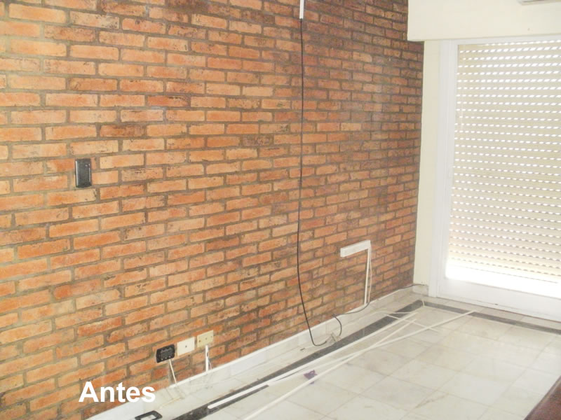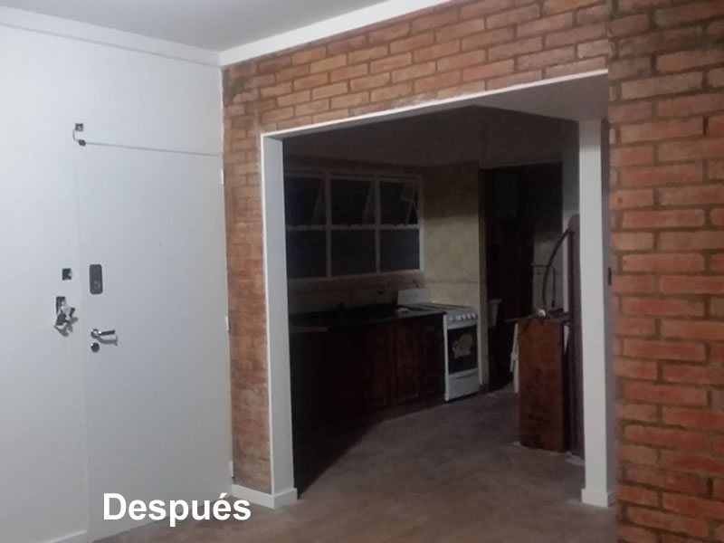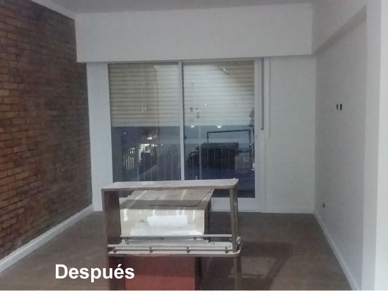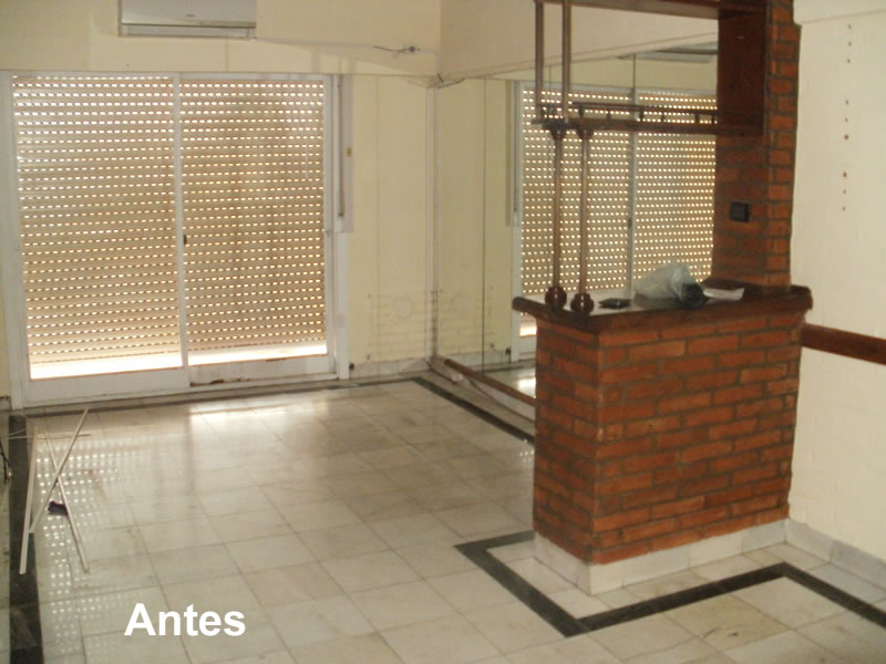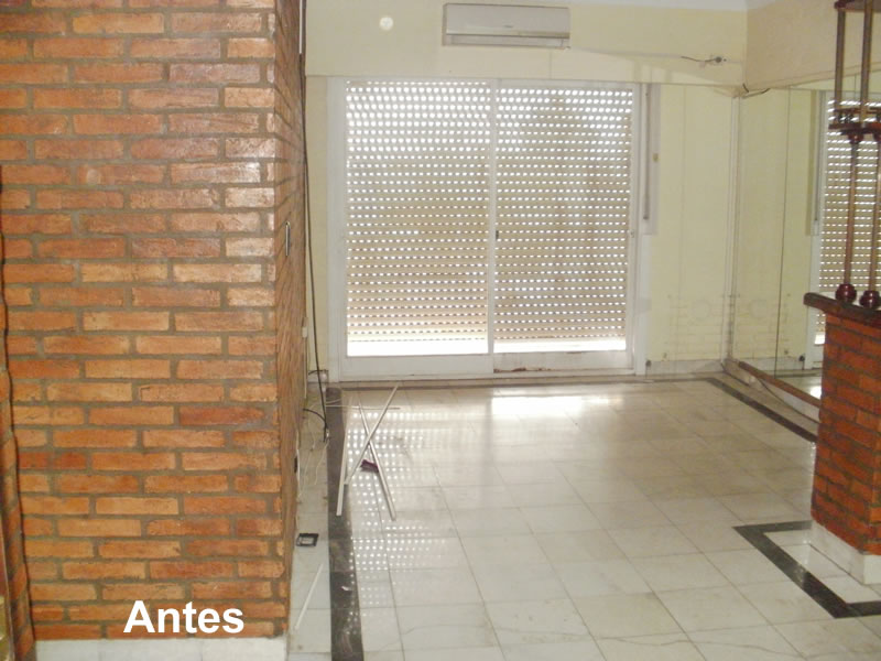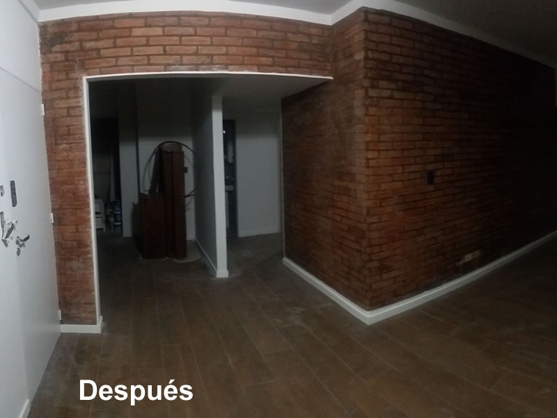 Por este motivo se retiró el revestimiento de ladrillo en las paredes del living comedor y en el pasillo, en casi su totalidad, y también los espejos que revestían una de las paredes. Además se demolió la barra que generaba una separación en el ambiente y parte de dos muros de la cocina para integrarla al ambiente principal. Junto con ello, se retiró el piso existente.